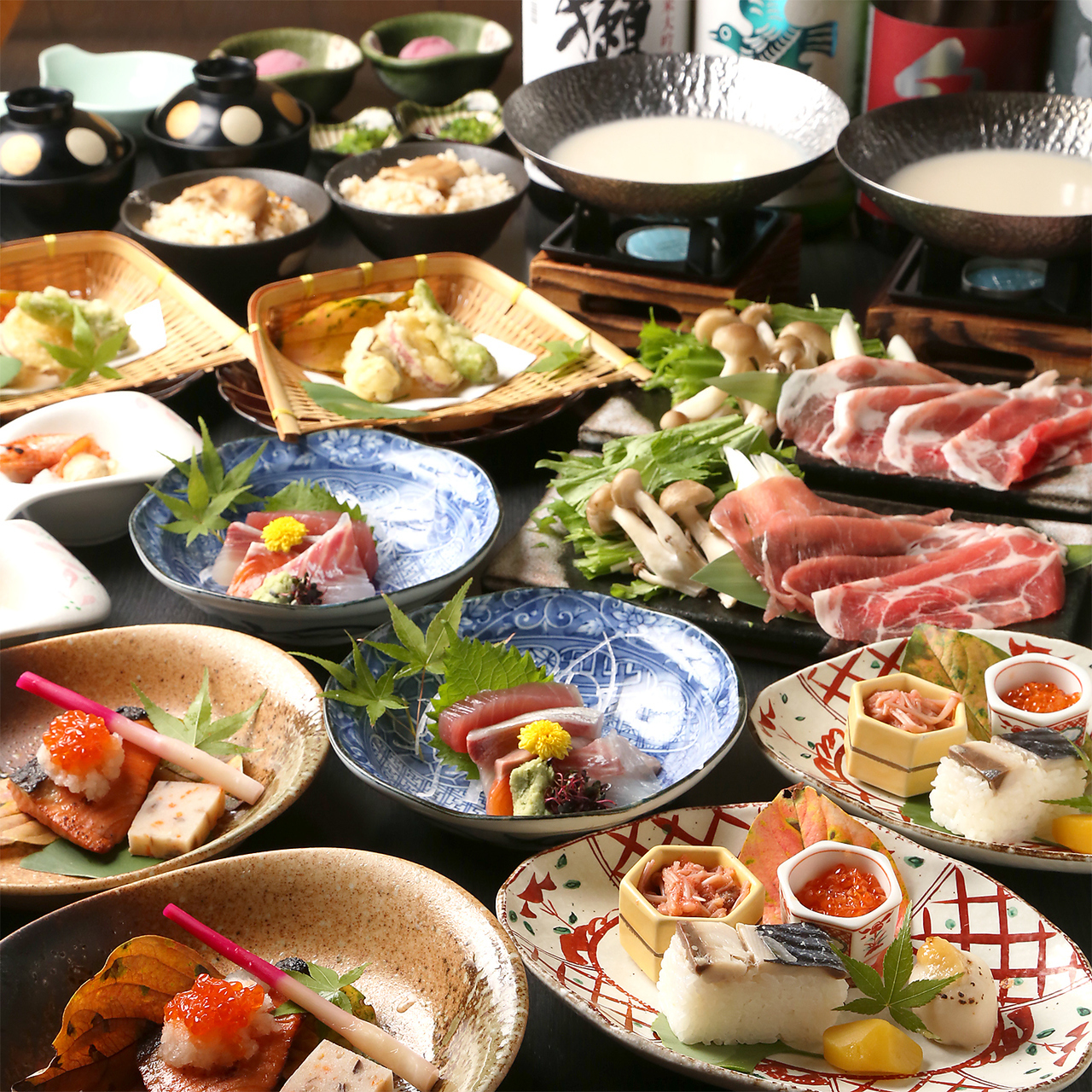 【宴会・同窓会などに◇2時間飲み放題つき】1名様分ずつのセパレート個別盛りで提供する、各種宴会おすすめのコース。季節の前菜から「栗豚ロースしゃぶしゃぶ小鍋」や「秋鮭幽庵焼き」など、「太刀魚茸巻き天婦羅」など料理長オススメの絶品揃い全10品のコースでございます。(L.O.30分前)※お料理のみの場合6000円でご提供致します。