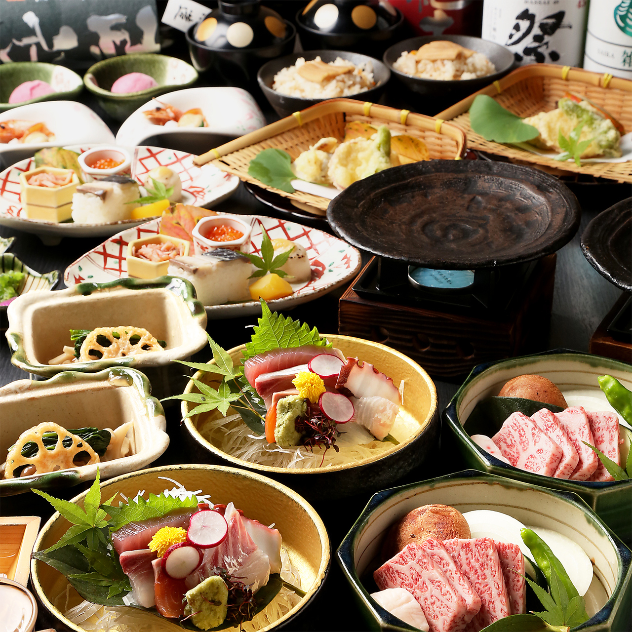 【熊野牛や季節を楽しむ当店自慢のコース・2時間飲み放題つき】「紅葉鯛の茸餡掛け」「御造り五種盛り」や「熊野牛サーロイン陶板焼き」「太刀魚茸巻き天婦羅」 など旬の食材をふんだんに使った贅沢なコースです。各種ご宴会は勿論、接待にもご利用頂けます。(L.O.30分前)※お料理のみの場合は7000円でご提供致します。